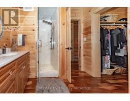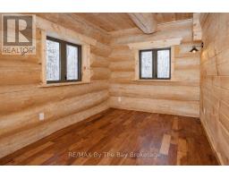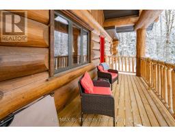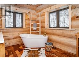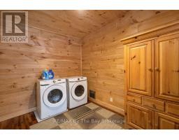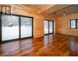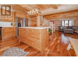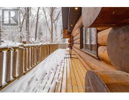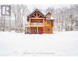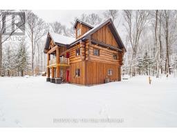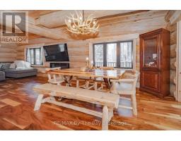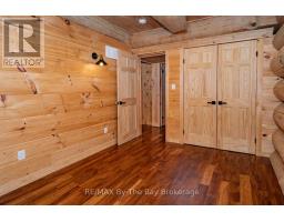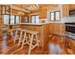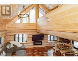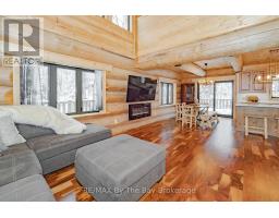 Nestled beneath a canopy of towering trees on a beautifully landscaped 1.27 acre private lot, this majestic three storey log home blends seamlessly into its natural surroundings. Warm, honey toned logs, meticulously crafted and stacked, create a timeless rustic elegance that welcomes you the moment you arrive. Step inside to an inviting atmosphere of cozy luxury. The open concept main level features a stunning kitchen with custom maple cabinetry, a large island, quartz countertops and a walkout to a three sided wraparound deck. Vaulted ceilings rise above the two storey great room where a show stopping staircase leads to the upper level, adding both drama and architectural charm. The walkout basement further enhances the home's versatility, offering entry access from three sides of the property, ideal for extended family or guests. This level is thoughtfully sectioned for in law capability, complete with a bright and spacious living area, a kitchenette and a full bath. Whether you are seeking a tranquil escape from the pace of everyday life or a home base for enjoying Muskoka's endless outdoor activities, this remarkable property is designed to exceed your expectations. (id:63952)